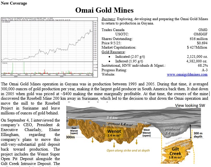 This week I am adding Omai Gold Mines for coverage in my newsletter. The company counts 6.5 million ounces of gold with major exploration potential to expand this project into a large long life mine. For the benefit of paid subscribers, I have provided an audio version of my interview with the company’s CEO, President and Board Chairlady, Elaine Ellingh…